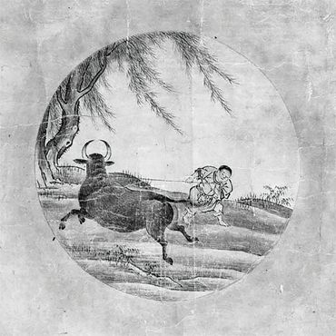 Long before the creation of the original ink drawings, the image of the ox was widely used and revered in China. The strong and mighty ox was seen everywhere in the fields, tilling the soil. Its domestication was essential for prosperous agriculture. Taming the ox was a necessity for a secure future.